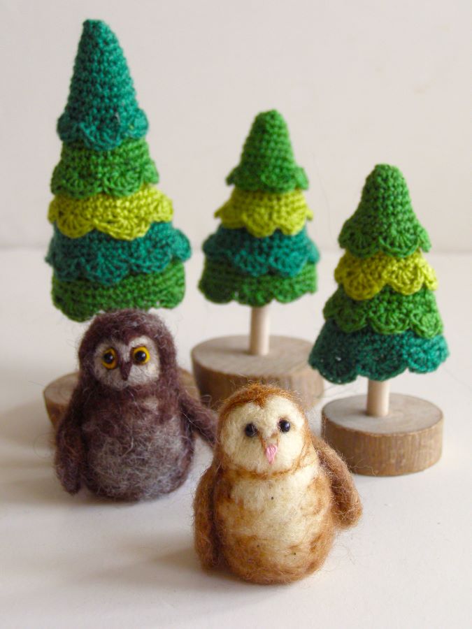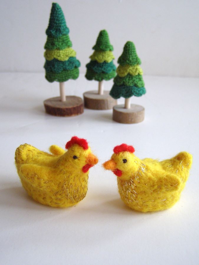 Ostatnio rzadko przyjmuję zamówienia na filcowe, szydełkowe lub robione na drutach zwierzątka. To znaczy, nawet jestem gotowa je robić, ale jak wycenić maleństwa, których wykonanie zajmuje mi 3-5 godzin pracy? Wyobraźcie sobie, że czasami nie jestem w stanie zrobić dwóch zwierzątek w ciągu jednego dnia roboczego! Uroki rękodzieła. Od czasu do czasu znajdują się jednak osoby, które mimo ceny, decydują się na takie zamówienie. Te zwierzątka (a właściwie ptaki), podobnie jak wiele ostatnio wykonanych przeze mnie prac, trafi do przedszkola. Przedstawiam Wam dwie mądre sowy, które będą siedziały na czubkach drzew oraz kurki złotopiórki.