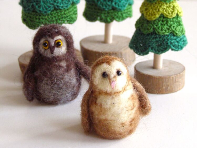 Ostatnio rzadko przyjmuję zamówienia na filcowe, szydełkowe lub robione na drutach zwierzątka. To znaczy, nawet jestem gotowa je robić, ale jak wycenić maleństwa, których wykonanie zajmuje mi 3-5 godzin pracy? Wyobraźcie sobie, że czasami nie jestem w stanie zrobić dwóch zwierzątek w ciągu jednego dnia roboczego! Uroki rękodzieła. Od czasu do czasu znajdują się jednak osoby, które mimo ceny, decydują się na takie zamówienie. Te zwierzątka (a właściwie ptaki), podobnie jak wiele ostatnio wykonanych przeze mnie prac, trafi do przedszkola. Przedstawiam Wam dwie mądre sowy, które będą siedziały na czubkach drzew oraz kurki złotopiórki.