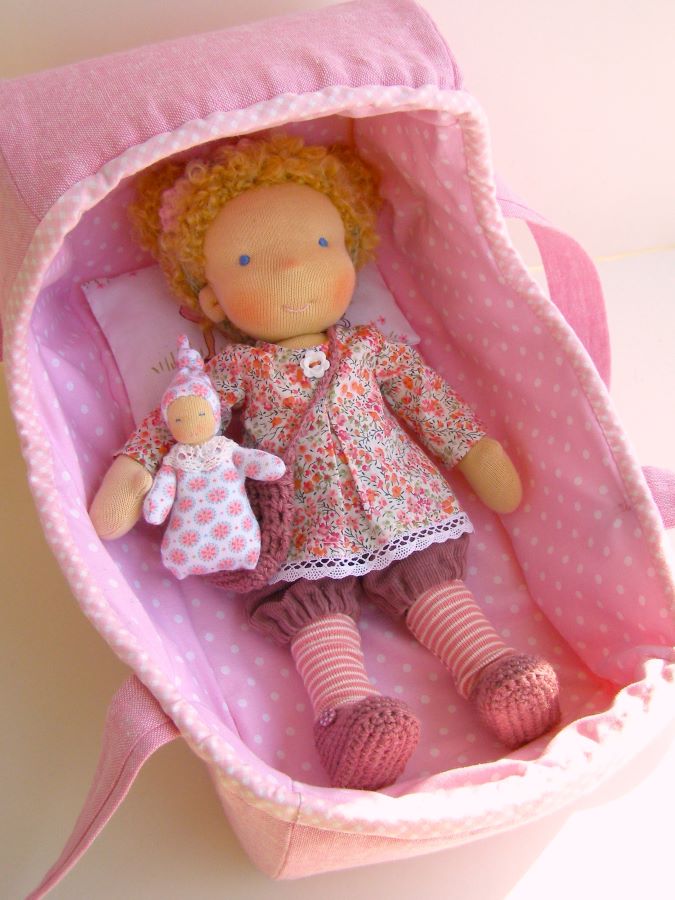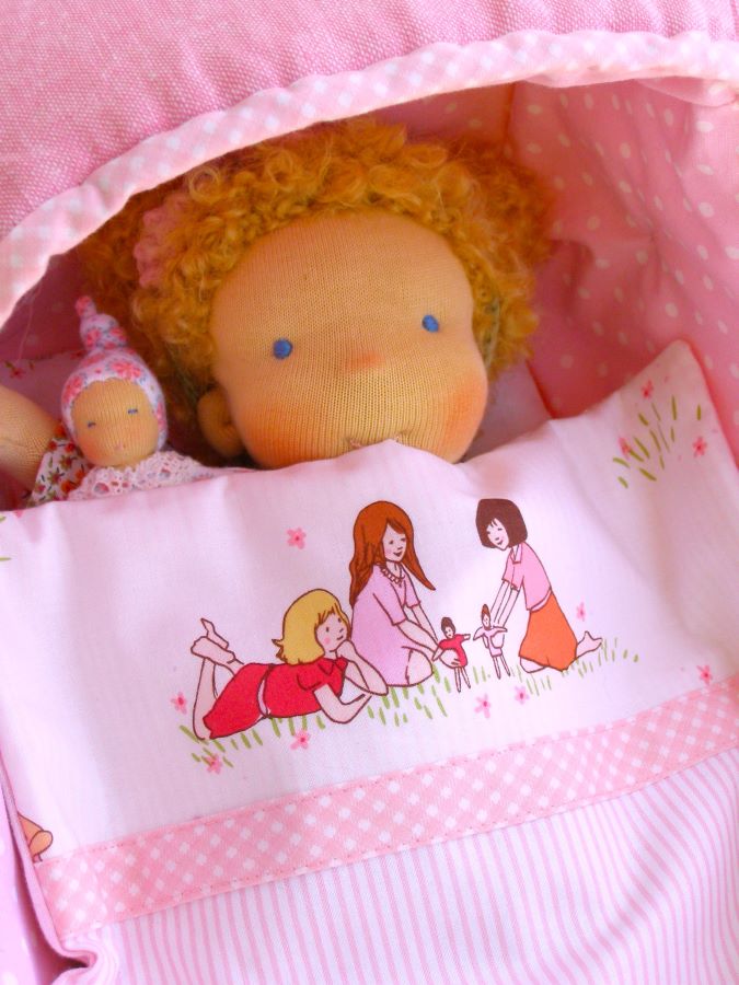 Dla młodszych dzieci lubię szyć małe lalki. Są poręczne, mieszczą się w małym plecaczku, wózku razem z dzieckiem, czy wreszcie w maminej torebce. Najnowsza Lalinda ma niecałe 30 cm wielkości. Jest normalnie rozbierana (ma bluzeczkę z pięknego angielskiego batystu, sztruksowe spodenki, skarpetki, buty, majtki, torebkę i opaskę). Szycie dla takiej małej lalki wymaga specjalnego doboru tkanin – w małe wzorki, cienkie paseczki, miękkie sztruksy, by całość prezentowała się proporcjonalnie. Jej fryzurka jest ułożona na stałe. Do domu pojedzie ze swoją malutką laleczką, która mieści się w jej torebce oraz nosidełkiem – łóżeczkiem. Widzicie ten wzorek na kołderce? Uwielbiam tkaniny projektowane przez Sarah Jane. Przypominają mi moje dzieciństwo – koc rozłożony trawie, na którym razem z koleżankami bawimy się w dom (koniecznie z lalkami). Mam nadzieję, że nowa mamusia ucieszy się tym zestawem.