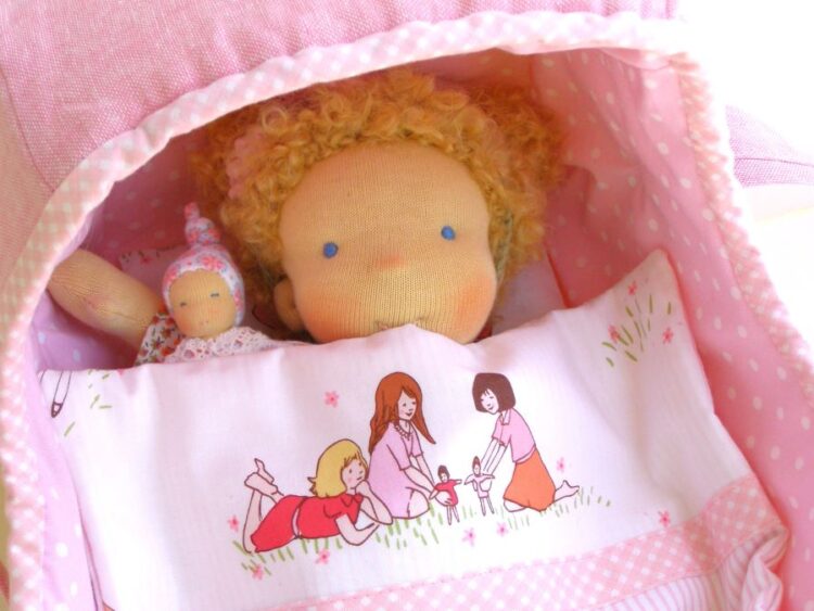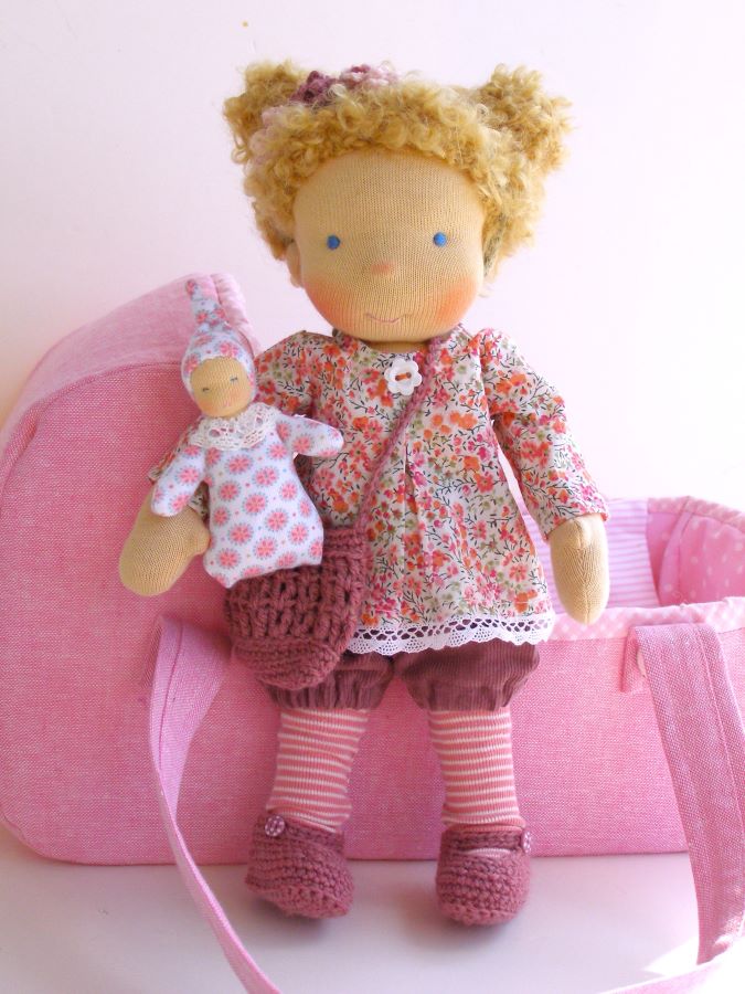 Dla młodszych dzieci lubię szyć małe lalki. Są poręczne, mieszczą się w małym plecaczku, wózku razem z dzieckiem, czy wreszcie w maminej torebce. Najnowsza Lalinda ma niecałe 30 cm wielkości. Jest normalnie rozbierana (ma bluzeczkę z pięknego angielskiego batystu, sztruksowe spodenki, skarpetki, buty, majtki, torebkę i opaskę). Szycie dla takiej małej lalki wymaga specjalnego doboru tkanin – w małe wzorki, cienkie paseczki, miękkie sztruksy, by całość prezentowała się proporcjonalnie. Jej fryzurka jest ułożona na stałe. Do domu pojedzie ze swoją malutką laleczką, która mieści się w jej torebce oraz nosidełkiem – łóżeczkiem. Widzicie ten wzorek na kołderce? Uwielbiam tkaniny projektowane przez Sarah Jane. Przypominają mi moje dzieciństwo – koc rozłożony trawie, na którym razem z koleżankami bawimy się w dom (koniecznie z lalkami). Mam nadzieję, że nowa mamusia ucieszy się tym zestawem.
