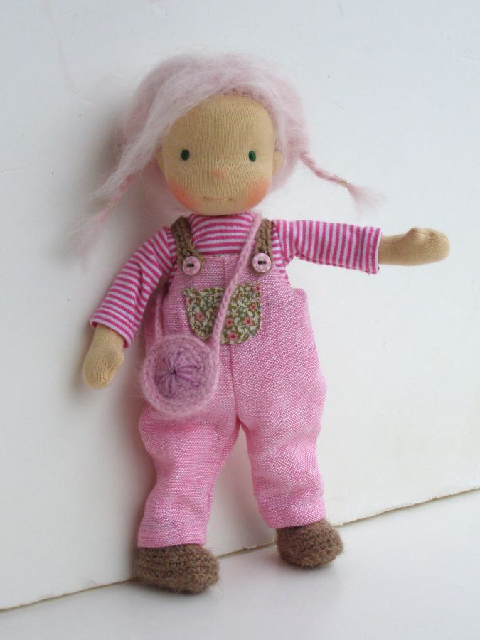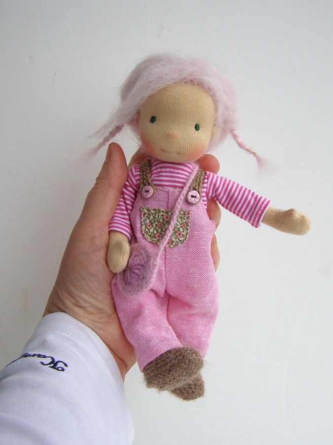 W mojej pracowni powstają mniejsze i większe prace. Ta lalka należy do tych mniejszych – ma około 20 cm wielkości. Na zdjęciu widać ją w mojej dłoni. Jest bardzo poręczna dla młodszych dzieci. Szczególnie takich, które lubią nosić ze sobą swoje zabawki. Zazwyczaj moje Lalindy mają włosy w naturalnych kolorach, ale te małe laleczki wyglądają naprawdę „wróżkowo” z cienkimi różowymi warkoczykami. Uszycie spodni ogrodniczek z dwucentymetrową kieszonką jest pracochłonne. Uszycie ubranek dla takiego malucha zajmuje praktycznie tyle samo czasu do dla większej lalki. Jednak uważam, że było warto. Całość prezentuje się naprawdę słodko. Mam nadzieję, że ten maluch przyniesie dużo radości swojej nowej mamie.