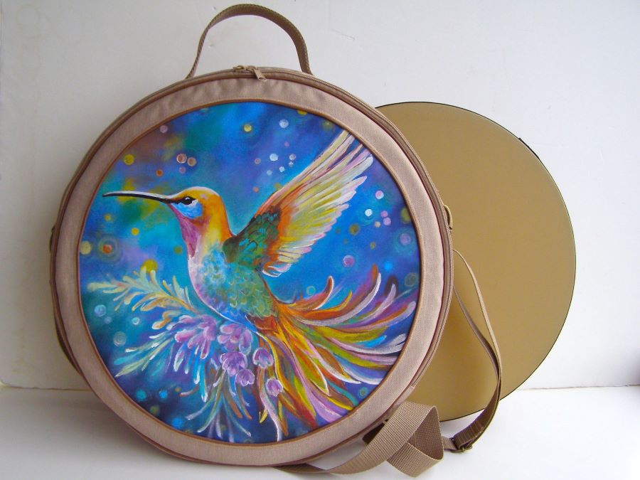 Wszystkie pokrowce, które wykonuję powstają na zamówienie. Dlaczego? Ponieważ bębny są różnej wielkości. Nawet jeśli średnica jest taka sama, to wysokość ramy może być inna (co oznacza inną szerokość pokrowca). Nie projektuję tych pokrowców. Wzór przesyła mi Zamawiający. Moją rolą jest przerobienie otrzymanego wzoru na motyw możliwy do odtworzenia w tkaninie. Od jakiegoś czasu stało się to dużo trudniejsze, ponieważ obrazki jakie dostaję często są tworzone przez sztuczną inteligencje. Są pełne kolorów i ozdobnych szczegółów. O włączeniu farb do produkcji pokrowców myślałam już wcześniej. Jestem z wykształcenia plastykiem, więc stwierdziłam, że może po bardzo długiej przerwie nadszedł czas, by wrócić do farb. I oto jest. Pierwszy malowany pokrowiec z motywem fantazyjnego kolibra. Co sądzicie o tym pomyśle?