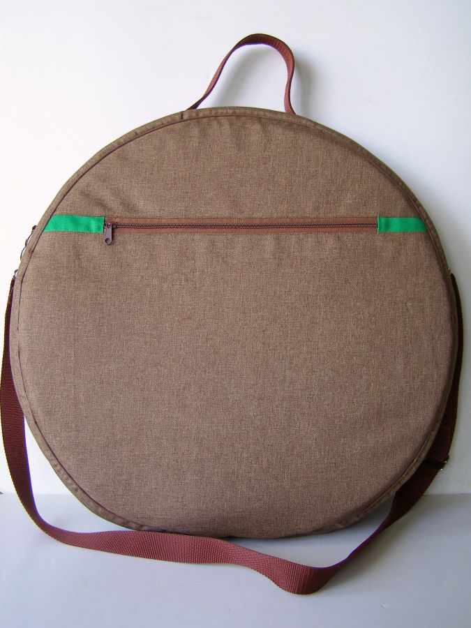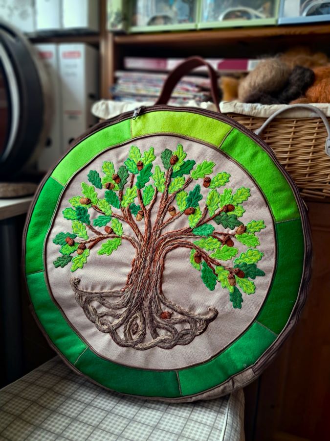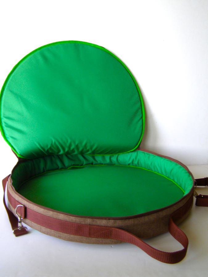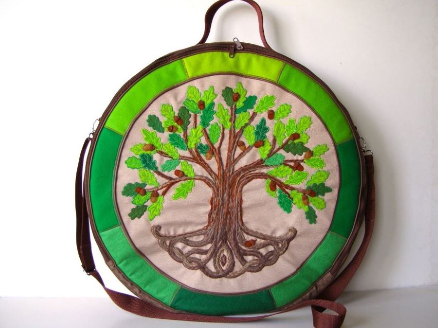 Prawie identyczny pokrowiec z motywem dębu uszyłam na swój bęben. Jest mi bardzo miło, że motyw spodobał się na tyle, by ktoś zażyczył sobie taki sam. Mój pokrowiec ma zrobione z drewnianych koralików żołędzie, które okazały się piękne, lecz mało praktyczne zwłaszcza w podróży (łatwo jest nimi zahaczać o przedmioty) oraz jest plecakiem. Ten pokrowiec ma naszyte żołędzie i można nosić na ramieniu oraz w ręce. I jak wszystkie inne, został wykonany z tkaniny wodoodpornej i usztywniony gąbką tapicerską. Zapraszam do obejrzenia szczegółów na zdjęciach.
